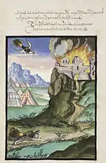 Helm was not the first to propose or use incendiary animals; the Biblical figure Samson is described as attaching torches to the tails of three hundred foxes, leaving the panicked beasts to run through the fields of the Philistines, burning all in their wake.[7] Early Sanskrit texts, early Scandinavian sources and the Primary Chronicle mention cats and birds bearing incendiary devices,[8] while the 10th century Chinese manual Hu Chhien Ching and its 11th century successor Wu Ching Tsung Yao describe and illustrate a series of "fire animals". These include "apricot-stone fire sparrows" carrying burning tinders attached to their legs inside an apricot stone, with the hope that they would fly into the enemy's granaries and set them on fire, and "magic-fire flying crows", artificial birds powered by four rocket tubes.[9] The 10th-century Kievan ruler Olga of Kiev is described in the Primary Chronicle as using flaming birds to wreak revenge on the Drevlyans for killing her husband Igor: