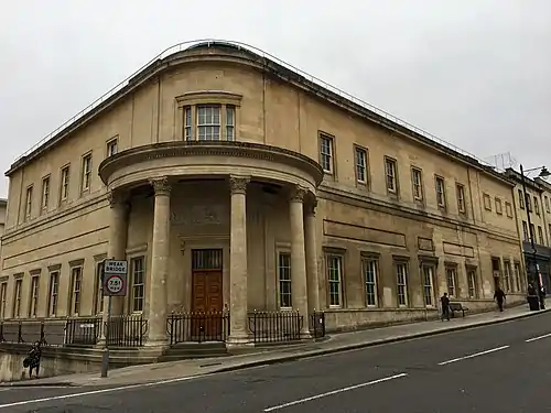 The building was initially built as The Philosophical Institution for the Advancement of Science, Literature and Art, later becoming a museum.[6][4] The Philosophical Institution was in operation from 1823 to 1871 and during that time merged with the Bristol Library Society, eventually moving site multiple times and becoming what is now Bristol City Museum.[7] In 1871 it was purchased by the Freemasons of Bristol and converted for their use. It was bombed during the Second World War and burnt extensively. It was rebuilt after the war and reopened in 1955.[8]