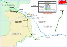 - ↑ See Alexandroupoli–Svilengrad railway. The railway is 178.5 km long minus 10 km in Turkey and 3 km in Bulgaria