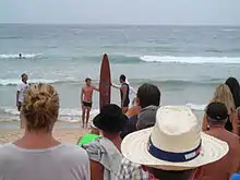 In December 1914, Duke Kahanamoku, the world sprint swimming champion, was touring Australia. He selected timber from a Sydney firm to fashion a board modelled on those used in his native Hawaii, and gave a demonstration to the press of surf board riding at Freshwater Beach[4] on Thursday 24 December. It was the second recorded time that anyone had surfed the clean waves beyond the break in Australian waters using this Hawaiian-style surfing technique. The first known surf board rider was Manly local Tommy Walker who rode a board at the 1912 Freshwater surf carnival.[5]