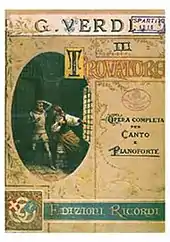 As business expanded, it became clear to Giovanni that also producing string and choral parts, for which there would be great demand by opera house orchestras, was another means of expanding the firm's involvement and also assuring composers that there would be uniformity.[8] However, although Ricordi began to publish full scores from the 1850s, they were never made available for sale, only for rent to opera houses.[6] Quite quickly, as Verdi's operas became more and more popular, this approach extended to producing all of the orchestral parts for each opera, most especially the three great successes of the 1850s, Rigoletto, Il trovatore, and La traviata, and those that followed when Tito Ricordi headed the firm.[8]
