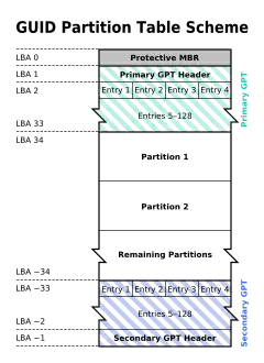 The GUID Partition Table (GPT) is a standard for the layout of partition tables of a physical computer storage device, such as a hard disk drive or solid-state drive, using universally unique identifiers, which are also known as globally unique identifiers (GUIDs). Forming a part of the Unified Extensible Firmware Interface (UEFI) standard (Unified EFI Forum-proposed replacement for the PC BIOS), it is nevertheless also used for some BIOSs, because of the limitations of master boot record (MBR) partition tables, which use 32 bits for logical block addressing (LBA) of traditional 512-byte disk sectors.
