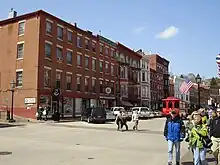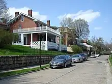 The Galena Historic District contains more than 1,000 buildings constructed before 1900 that are considered contributing properties.[6][8] The center of downtown Galena is laid out in three parallel segmental tiers starting at Main Street closest to the river. Beyond Main Street, and at a higher elevation, are Bench and Prospect Streets.[6] Main Street forms the primary commercial strip through Galena and is lined with buildings two, three, and four stories tall.[3][6] Most of Main Street's structures are built of red brick and cast in Federal style of the simple commercial style of the 1840s.[3][6]