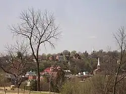 On Bench Street, most of the buildings are public or fraternal buildings, among them some of the district's principal churches. Viewed from the levee or the railroad tracks, the church steeples crown downtown.[6] Backdropping the prominent church steeples of Bench Street is the wooded terrace of Prospect Street. Prospect Street is mostly residential with the large old high school and its clock tower being the evident exception.[6] Northwest of Prospect Street the residential area continues. Many of the private homes in this area date from Galena's early days. The concentration of 19th-century homes, both beyond Prospect Street and on the opposite side of the Galena River, was labeled "astonishing" in the National Register nomination document.[6]