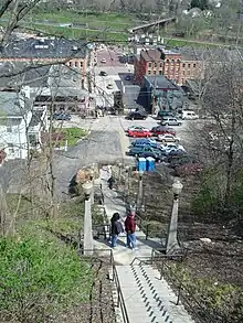 Bench and Main Street viewed from Prospect Street; stairs provide pedestrian access to the high points in downtown.