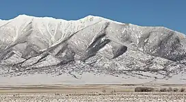 Galena Peak is set on the east side of the San Luis Valley, on the crest of the Sangre de Cristo Range which is a subrange of the Rocky Mountains. It is the sixth-highest summit in Fremont County and can be seen from Highway 285 near the community of Villa Grove.[2] The mountain is located in the Sangre de Cristo Wilderness, on land managed by San Isabel National Forest and Rio Grande National Forest.[4] Precipitation runoff from the mountain's west slope drains to San Luis Creek and the east slope drains to the Arkansas River via Hayden Creek. Topographic relief is significant as the summit rises 3,860 feet (1,177 m) above the San Luis Valley in two miles (3.2 km). An ascent of the peak from Hayden Pass involves hiking seven miles (11 km) with approximately 1,800 feet (549 m) of elevation gain.[6] The mountain's toponym has been officially adopted by the United States Board on Geographic Names.[3]