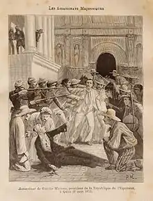 García Moreno was assassinated in the steps of the National Palace in Quito,[9] struck down with knives and revolvers, later re-tellings of the event by his admirers attributing to him the following last words: "¡Dios no muere!" ("God does not die!"). Faustino Rayo assaulted him with several blows of a machete, while three or four others fired their revolvers.[1][9]