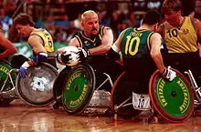 ![]() Garry Croker (#10) blocks an opponent during a wheelchair rugby game at the 2000 Paralympics. | |