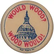 Campaign button from Wood's 1920 presidential campaign, which uses his name to make a play on words