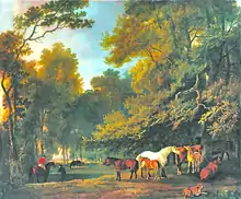 Barret often worked with other artists, particularly when depicting animals. The Lowther painting of Knipe Scar included dogs that were painted by George Stubbs and the sportsmen by Philip Reinagle and a painting sold in 1802 had figures attributed to Francis Wheatley.[30]