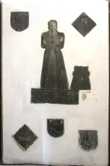 Firstly in about 1561, to Wilmota Giffard (1540/1–1581),[2][5] daughter and sole heiress of John Giffard of Yeo Vale, Alwington, North Devon, and step-daughter of Robert Cary (died 1586) of Clovelly, Devon, half-uncle to Sir George Cary. Cary was her second husband; she was previously the wife of John Bury (1540–1574) of Colleton in the parish of Chulmleigh, Devon, whom she had married when both parties were aged only 13, and contrary to ecclesiastical law. Bury was said by Pole to have been "simple",[6] and the couple were divorced in 1560 by Matthew Parker, Archbishop of Canterbury.[7] Her monumental brass survives in St Saviour's Church, Tor Mohun. Its inscription states that she had two sons and three daughters by Carey.[8] These included:[4]
