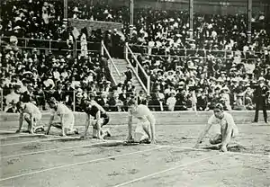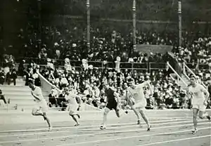 The men's 100 metres was a track and field athletics event held as part of the Athletics at the 1912 Summer Olympics programme. It was the fifth appearance of the event, which is one of 12 athletics events to have been held at every Summer Olympics. The competition was held on 6 July 1912 and on 7 July 1912. Seventy runners from 22 nations competed.[1] NOCs could enter up to 12 athletes.[2] The event was won by Ralph Craig of the United States, as the Americans swept the medals for a second time (previously having done so in 1904).