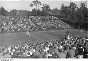 In 1935, in his fourth successive North of England competition, Rogers was deprived from his doubles title by Frank Wilde and Don Butler. For the singles he took on his doubles partner Alan Stedman but was easily beaten.[53] In April at Melbury final Bunny Austin annihilated the Irishman, allowing only three games to him.[54] In the 1937 Wimbledon Championships, his first-round match against Bunny Austin was the first ever televised tennis event in Great Britain that was broadcast to 2000 homes throughout the British Isles.[55][56] He won his second Manchester title later the year.[51] In 1938 he became the Bournemouth hard court doubles champion alongside Kho Sin-Kie with whom he scored a five-set victory over Wilde-Butler.[57]