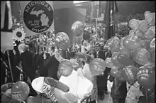 For the fall 1964 elections, Romney cut himself off from the national ticket, refusing to even appear on the same stage with them[149] and continuing to feud with Goldwater privately.[27] He campaigned for governor in mostly Democratic areas, and when pressed at campaign appearances about whether he supported Goldwater, he replied, "You know darn well I'm not!"[150] Romney was re-elected in 1964 by a margin of over 380,000 votes over Democratic Congressman Neil Staebler, despite Goldwater's landslide defeat to President Lyndon B. Johnson that swept away many other Republican candidates.[98][151][152] Romney won 15 percent of Michigan's black vote, compared to Goldwater's two percent.[98]