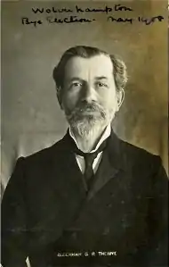 In nearly every way Thorne seemed the stereotypical Liberal of his day; a pronounced nonconformist, a Baptist,[3] in a constituency where there were many nonconformist voters.[4] In his election meetings and literature he declared himself a supporter of Free Trade, the proposed Bill on Old Age Pensions, restricting to eight the hours that miners could be made to work daily, women's suffrage, Irish Home Rule and any necessary reform of the House of Lords.[5] He was also strongly in favour of temperance and a supporter of the disestablishment of the Church of England.[3]