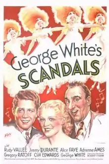 George White's Scandals is a 1934 American pre-Code musical film directed by George White and written by Jack Yellen. The film stars Rudy Vallée, Jimmy Durante, Alice Faye, Adrienne Ames, Gregory Ratoff, Cliff Edwards and Dixie Dunbar.[1][2][3] The film was released on March 16, 1934, by Fox Film Corporation. George White also produced George White's Scandals for RKO in 1945. It was directed by Felix E. Feist and starred Joan Davis and Jack Haley.