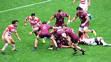 Lelo or lelo burti (Georgian: ლელო ბურთი), literally a "field ball [playing]", is a Georgian folk sport, which is a full contact ball game, and very similar to rugby.[4] Within Georgian rugby union terminology, the word lelo is used to mean a try, and the popularity of rugby union in Georgia has also been attributed to it.[5] In 2014, lelo burti, along with khridoli, a traditional martial art, was inscribed by the government of Georgia as a "nonmaterial monument" of culture.[6]