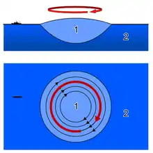 A northern-hemisphere gyre in geostrophic balance. Paler water is less dense than dark water, but more dense than air; the outwards pressure gradient is balanced by the 90 degrees-right-of-flow coriolis force. The structure will eventually dissipate due to friction and mixing of water properties.