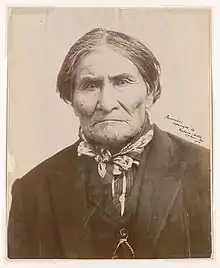 Many portraits were made during the Louisiana Purchase Exposition in 1904, when tribes from all parts of the world were represented. The director of the Field Museum of Natural History saw the opportunity to get a valuable ethnological collection if he could get a photographer, so he called on Charles Carpenter, the museum's staff photographer, Frances Benjamin Johnston and the Gerhard Sisters. They agreed to take pictures of all the Native Americans and other ethnic groups he could bring, and their collection is a rare one.[2] One of those portraits is that of Geronimo, that contains an accidental "portrait" of the photographer at work. It is reflected in Geronimo's eye and was discovered in 2009 when the Library's photo conservator realized someone was looking back at her as she worked. The "portrait" shows a woman wearing a white shirtwaist blouse with a dark skirt, the uniform of the New Woman of the 1890s and early 1900s.[1]