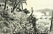 Shortly before the squadron arrived, the settlement of chief Manga Ndumbe Bell, who had signed a treaty with Nachtigal, had been burned down and the German flag removed. Admiral Knorr decided on immediate intervention and sent landing parties ashore to destroy the villages of the rebels and arrest their chiefs. Two coastal steamers, the Fan and the Dualla were used as landing craft to bring 307 soldiers ashore at Hickorytown on 20 December. The landing party received word that rioters on the opposite bank had attacked the Jantzen & Thormählen factories and carried off their managers, and they stormed Joss town to try and recover them. The next day the Olga steamed upriver on the rising tide and bombarded the local villages. The landing party returned to their ships on 22 December. The Olga, with Rear Admiral Knorr on board, remained in the area where the anti-German uprising had taken place. Calm was gradually restored; in January 1885 the violence ended and in March the murderer of the factory manager was handed over for execution.[19]