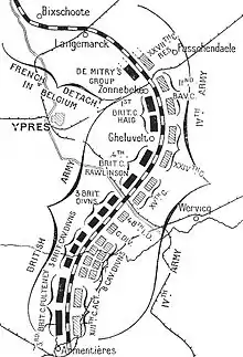 - ↑ Writers and historians have criticised the term Race to the Sea and used several date ranges, for the period of mutual attempts to outflank the opposing armies on their northern flanks. In 1925, Edmonds the British Official Historian, used dates of 15 September – 15 October and in 1926 17 September – 19 October.[35][36] In 1929 the fifth volume of Der Weltkrieg the German Official History, described the progress of German outflanking attempts, without labelling them.[37] In 2001 Strachan used 15 September – 17 October.[38] In 2003 Clayton gave dates from 17 September – 7 October.[39] In 2005, Doughty used the period from 17 September – 17 October and Foley from 17 September to a period between 10–21 October.[40][41] In 2010 Sheldon placed the beginning of the "erroneously named" race from the end of the Battle of the Marne to the beginning of the Battle of the Yser.[42]