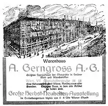 Alfred Abraham Gerngroß (1844–1908) from Forth near Nuremberg, who had learned the drapers trade from August Herzmansky, who had founded, in 1863, a prominent Viennese drapery. Then on 26 September 1879, with his younger brother Hugo (1857–1929), Alfred founded his own store on the corner of Mariahilferstrasse 48 and the Kirchengasse. After a period of competition with his former employer, August Herzmansky, the two companies tried to work together, but this did not prosper, and the collaboration ceased again in 1881.[1]