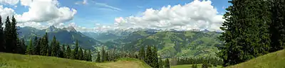 During the Bronze Age there was a hill fort on the Cholis Grind near the modern village of Saanen. The region was occupied by the Gallo-Romans until the 10th or 11th century when the Alamanni began to drive them out. This migration created the modern language borders in Switzerland.[4] During the Middle Ages several forts were built to guard the mule trails into the Valais and Vaud. These included the Kramburg (which was first mentioned in 1331 but is now covered by later construction), the Swabia Ried tower (11th-12th century) and the Schönried tower (remains are visible as part of house number 349). During the Middle Ages it was part of the vogtei of Vanel in the county of Gruyère. In 1244, the counts became the vassals of Savoy. The counts' financial problems forced them to sell parts of the vogtei and some of the rights to the residents of Saanen in the 14th century.[4] The village then became the center of the Saanen district and parish.
