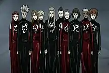Gilgamesh are six men and four women, capable of using Dynamis, who work for the scientist/terrorist Enkidu. Often portrayed as the antagonists and enemies of Orga, they are the 10 test subjects that Enkidu fled Heaven's Gate with. Their goal is to serve Enkidu by destroying the tower created to restore the blue sky and later cleanse the world in order to perpetuate a new species of human. Gilgamesh are created as half human, half god and made of anti-matter. They are referred to as 'God Beasts', referring to their second, non human forms. Gilgamesh are named after the lot number they were in the tomb of Gilgamesh. The female members of Gilgamesh wear red and the male members wear black and their tattoos, each in different places on their bodies, signify different aspects of divinity. The Gilgamesh never reveal their names in the anime.