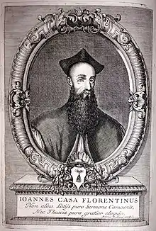 Giovanni della Casa (28 June 1503 – 14 November 1556) was an Italian poet, diplomat, clergyman and inquisitor, and writer on etiquette and society. He is celebrated for his famous treatise on polite behavior, Il Galateo overo de’ costumi (1558). From the time of its publication, this courtesy book has enjoyed enormous success and influence. In the eighteenth century, influential critic Giuseppe Baretti wrote in The Italian Library (1757), "The little treatise is looked upon by many Italians as the most elegant thing, as to stile, that we have in our language."[1]