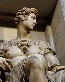 Giuliano's tomb in the Medici Chapel[2] of the Church of San Lorenzo, Florence, is ornamented with the Night and Day of Michelangelo, along with a statue of Giuliano by Michelangelo. He shares an identical common name (Giuliano de' Medici) with his uncle Giuliano di Piero de' Medici, whose tomb is also in the Medici Chapel and who is famous for having been assassinated in the Pazzi Conspiracy.