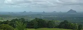 The Glass House Mountains are a group of dome shaped hills and conical peaks rising sharply above the surrounding sub-coastal lowlands.[4] They are the remnants of rhyolite and trachyte volcanic plugs and are located in southeast Queensland 65–75 kilometres (40–47 mi) north of Brisbane and west of the townships of Glass House Mountains and Beerburrum.[3]