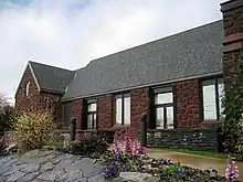 The Trinity Lutheran Church congregation was founded in 1917 and acquired their first church in 1923.[1] By the 1940s the congregation needed a larger place to worship and bought a lot on the corner of Fifth Avenue and East Main Street in downtown Hillsboro in 1941.[1] [2] A Camas, Washington, rock quarry offered the church an unlimited amount of red colored rock for $1,000 as a long as the church transported the rock back to Hillsboro.[1] Construction began in 1947 and the new church was completed in 1949.[1] By the late 1990s Trinity Lutheran had again outgrown their church and began building a new campus in the southeast part of the city.[1]