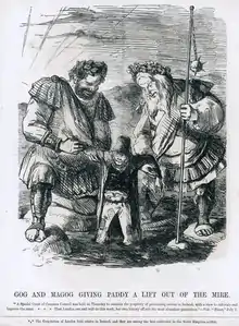 "Gog and Magog giving Paddy a Lift Out of the Mire." From Punch magazine, 1849. Here the giants stand for London, said to be assisting Ireland after the famine by purchasing land to improve trade.[28]