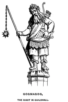 The effigies of Gogmagog and Corineus, used in English pageantry and later instituted as guardian statues at Guildhall in London eventually earned the familiar names "Gog and Magog".