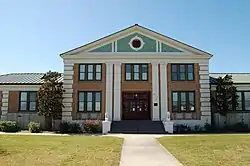 Designed by New Orleans architects Favrot and Livaudais, the Classical Revival brick building was erected in 1931. It features a two-story central block with one-story wings on each side. Grades one through ten were taught until 1933, when the school obtained high school accreditation. The school gave opportunities for sports almost as soon as it opened, and a band was organized in 1939.[2][3] Golden Meadow High stopped operations in 1966 since it consolidated with Larose-Cut Off High School to form South Lafourche High School in Galliano.[4] The building is currently Golden Meadow Middle School.[5]