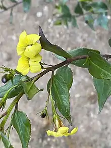Goodenia ovata, commonly called the hop goodenia,[2] is a species of flowering plant and is endemic to south-eastern Australia. It is a shrub with sticky, often varnished foliage, toothed egg-shaped to elliptic leaves and racemes or thyrses of yellow flowers.