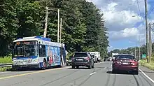 The Hartford and West Hartford Horse Railroad was incorporated in 1863 to run horsecar service on Farmington Avenue. It was later electrified and extended to Unionville as the Farmington Street Railway, following Farmington Avenue except for a small section of private right-of-way in eastern Farmington. It was acquired by the New York, New Haven and Hartford Railroad in 1909 and became part of the Connecticut Company Hartford Division in 1910. Streetcars on the line were replaced by buses on June 5, 1933.[4][5]