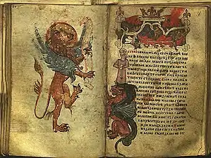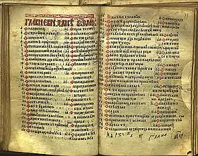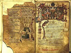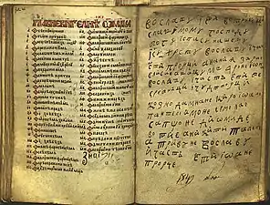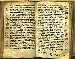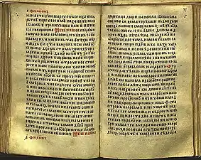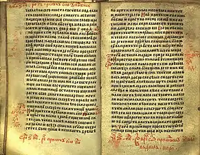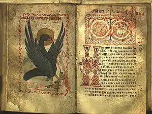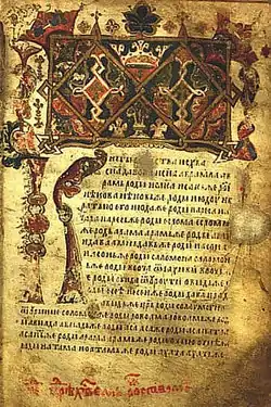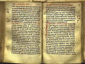 The Gospel of Saint Nicholas (Serbian Cyrillic: Никољско јеванђеље) is a Serbian illuminated manuscript written on parchment in 13th from the Monastery of St. Nicholas of Rošci, with size of 16x10.5 cm, 144 pages and 17 editions of text on each of the pages decorated with illuminations, initials and flags, gold and silver details. According to the historian Pavel Šafarik (1858), this Gospel he calls it "The Gospel of Queen Jelena", was written for Helen of Anjou, between 1240 and 1250.[1]