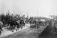 The division was then split up with the 3rd Cavalry Brigade serving with First Army, 4th Cavalry Brigade with Third Army and 5th Cavalry Brigade with Fourth Army.[13] The brigades variously took part in the battles of the Hindenburg Line: the battles of Canal du Nord (27 September–1 October), St. Quentin Canal (29 September–2 October), Beaurevoir Line (3–5 October) and Cambrai (8–9 October) and the Pursuit to the Selle (9–12 October). Its final action was to take part in the Advance in Picardy (17 October–11 November) including the Battle of the Sambre (4 November) and the capture of Mons (11 November, 3rd Canadian Division with 5th (Royal Irish) Lancers and one section[lower-alpha 8] of D Battery, RHA).[13]