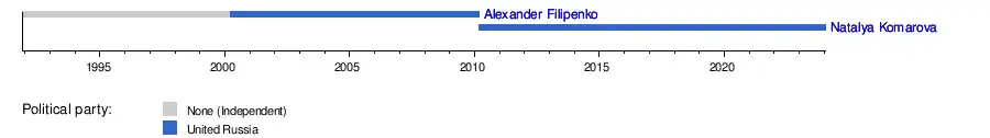 On 8 February 2010, with the expiration of Filipenko's term of office, the President of Russia Dmitry Medvedev proposed the candidacy of MP Natalya Komarova to the Duma of Khanty-Mansi Autonomous Okrug.[1] She was supported unanimously and was sworn in on 1 March 2010, becoming Russia's third female governor.[2]