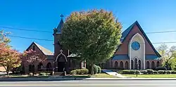 Grace Episcopal Church is a historic Episcopal church located at 419 S. Main Street in Lexington, Davidson County, North Carolina. It was built in 1902, and is a one-story, Late Gothic Revival style red brick building. It features a steeply pitched gable roof, lancet-arched doors and windows, buttresses, a front corner bell tower, and a three-part stained-glass window produced by Tiffany Studios in 1918.[2]