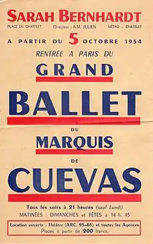 - ↑ Staff. "Season of Duels Opens in France; Marquis de Cuevas, 72, Is Challenged by Dancer, 52, in Dispute Over Ballet", The New York Times, 25 March 1958. Accessed 11 November 2008.