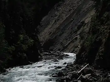 The Grand Canyon of the Elwha is a deep canyon on the Elwha River located below Dodger Point approximately 5 miles (8.0 km) upstream from the now-drained Lake Mills in Washington, United States. It can be reached approximately 3.5 miles (5.6 km) from the Whiskey Bend trailhead via the Geyser Valley trail. It is also about 1⁄2 mile (0.80 km) from Humes Ranch Cabin and 1.4 miles (2.3 km) from Goblins Gate.