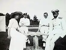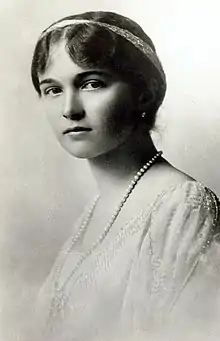 Before World War I, there was some discussion of a marriage between Olga and Prince Carol of Romania. In 1914, Foreign Minister Sergey Sazonov advocated the match because he wanted to ensure that the Romanian royal family would support Russia in case of a future conflict.[62] Nicholas and Alexandra saw the benefits of the match, but they insisted that "the grand duchess's marriage ... should take place only as the result of a much closer acquaintance between the young people and on the absolute condition of their daughter's voluntary agreement to it."[63] In March 1914, Crown Prince Ferdinand of Romania, Crown Princess Marie of Romania, and Prince Carol of Romania visited the Romanovs in St. Petersburg. Despite going on walks and dinners with each other, Olga and Carol seemed uninterested in each other. During a visit to Romania in the spring of 1914, Olga and Carol were uninterested in each other and did not speak to each other.[64] Crown Princess Marie of Romania noted that Carol was "not enamored of Olga's broad, plain face and brusque manner."[65] She judged that Olga's face "was too broad, her cheekbones too high,"[66] and she told her mother that all of the grand duchesses "were not found very pretty."[67] Marthe Bibesco, who was with the Romanian party, heard a rumor that the grand duchesses had "decided... to make themselves as ugly as they could.... so that Carol should not fall in love with any of them."[68]
