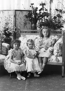Tatiana was born on 10 June 1897. She was the second child and daughter of Emperor Nicholas II and Empress Alexandra. She weighed 3.9 kg at birth, and Dr. Ott used forceps in her birth.[32] When she regained consciousness from the chloroform used during the delivery, Alexandra saw the "anxious and troubled faces" around her and wept: "My God, it is again a daughter. What will the nation say, what will the nation say?"[32] Grand Duke Konstantin Konstantinovich wrote that "everyone was very disappointed as they had been hoping for a son."[32] Grand Duke George Alexandrovich, Nicholas' younger brother, told Nicholas "I was already preparing to go into retirement, but it was not to be."[32] Under the Pauline Laws, the Imperial throne of Russia could not pass to a woman unless all legitimate male lines died out. As such, Nicholas' heir was his brother George unless he had a son. Grand Duchess Tatiana's siblings were Grand Duchesses Olga, Maria, Anastasia, and Tsarevich Alexei of Russia. All of the children were close to one another and to their parents up until the end of their lives.