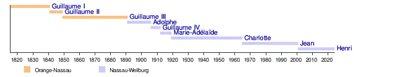 Henri, Grand Duke of LuxembourgJean, Grand Duke of LuxembourgCharlotte, Grand Duchess of LuxembourgMarie-Adélaïde, Grand Duchess of LuxembourgWilliam IV, Grand Duke of LuxembourgAdolphe, Grand Duke of LuxembourgWilliam III of the NetherlandsWilliam II of the NetherlandsWilliam I of the Netherlands