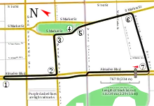 The course began on Almaden Boulevard running northerly along the southbound lanes of the road crossing VTA light rail tracks at San Carlos St. Just before reaching Santa Clara Street the course reached turn one, an abrupt hairpin that caused the drivers to double back in the southbound direction along Almaden Blvd again in the opposite direction of normal traffic. The course then turned east along Park Avenue at turn two. Turn 3 took the drivers on to Market Street passing Plaza de César Chávez through the shallow chicane of turns four and five again crossing the VTA light rail track. The course then turned right on to Balbach at turn 6. At the final turn 7 the course again turned right back on to Almaden Blvd. The entrance to the pit lane was also at turn 7.