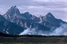 In addition to 13,775-foot-high (4,199 m) Grand Teton, another nine peaks are over 12,000 ft (3,700 m) above sea level.[66] Eight of these peaks between Avalanche and Cascade Canyons make up the often-photographed Cathedral Group.[67] The most prominent peak north of Cascade Canyon is the monolithic Mount Moran (12,605 ft (3,842 m)) which rises 5,728 ft (1,746 m) above Jackson Lake.[68] To the north of Mount Moran, the range eventually merges into the high altitude Yellowstone Plateau. South of the central Cathedral Group the Teton Range tapers off near Teton Pass and blends into the Snake River Range.[69]