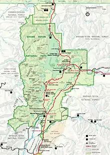 Grand Teton National Park is located in the northwestern region of the U.S. state of Wyoming.[58] To the north the park is bordered by the John D. Rockefeller Jr. Memorial Parkway, which is administered by Grand Teton National Park. The scenic highway with the same name passes from the southern boundary of Grand Teton National Park to West Thumb in Yellowstone National Park.[36] Grand Teton National Park covers approximately 310,000 acres (130,000 ha), while the John D. Rockefeller Jr. Memorial Parkway includes 23,700 acres (9,600 ha).[59] Most of the Jackson Hole valley and virtually all the major mountain peaks of the Teton Range are within the park. The Jedediah Smith Wilderness of Caribou-Targhee National Forest lies along the western boundary and includes the western slopes of the Teton Range. To the northeast and east lie the Teton Wilderness and Gros Ventre Wilderness of Bridger-Teton National Forest.[60] The National Elk Refuge is to the southeast, and migrating herds of elk winter there. Privately owned land borders the park to the south and southwest. Grand Teton National Park, along with Yellowstone National Park, surrounding National Forests and related protected areas constitute the 18-million-acre (73,000-square-kilometer) Greater Yellowstone Ecosystem. The Greater Yellowstone Ecosystem spans portions of three states and is one of the largest intact mid-latitude ecosystems remaining on Earth.[61] By road, Grand Teton National Park is 290 mi (470 km) from Salt Lake City, Utah and 550 mi (890 km) from Denver, Colorado.[62]
