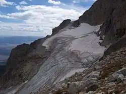 The major peaks of the Teton Range were carved into their current shapes by long-vanished glaciers. Commencing 250,000–150,000 years ago, the Tetons went through several periods of glaciation with some areas of Jackson Hole covered by glaciers 2,000 ft (610 m) thick.[63][80] This heavy glaciation is unrelated to the uplift of the range itself and is instead part of a period of global cooling known as the Quaternary glaciation.[80] Beginning with the Buffalo Glaciation and followed by the Bull Lake and then the Pinedale glaciation, which ended roughly 15,000 years ago, the landscape was greatly impacted by glacial activity. During the Pinedale glaciation, the landscape visible today was created as glaciers from the Yellowstone Plateau flowed south and formed Jackson Lake, while smaller glaciers descending from the Teton Range pushed rock moraines out from the canyons and left behind lakes near the base of the mountains.[80] The peaks themselves were carved into horns and arêtes and the canyons were transformed from water-eroded V-shapes to glacier-carved U-shaped valleys.[63] Approximately a dozen glaciers currently exist in the park, but they are not ancient as they were all reestablished sometime between 1400 and 1850 AD during the Little Ice Age.[81] Of these more recent glaciers, the largest is Teton Glacier, which sits below the northeast face of Grand Teton. Teton Glacier is 3,500 ft (1,100 m) long and 1,100 ft (340 m) wide, and nearly surrounded by the tallest summits in the range.[80] Teton Glacier is also the best-studied glacier in the range, and researchers concluded in 2005 that the glacier could disappear in 30 to 75 years.[73] West of the Cathedral Group near Hurricane Pass, Schoolroom Glacier is tiny but has well-defined terminal and lateral moraines, a small proglacial lake, and other typical glacier features near each other.[82]